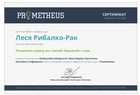 Студентки освітньо-наукової програми «Організаційна психологія» кафедри менеджменту Полтавського університету економіки і торгівлі Леся Рибалко-Рак і Надія Власенко успішно завершили онлайн-курс «Психологія стресу та способи боротьби з ним», який реалізується на платформі масових відкритих онлайн-курсів Prometheus.