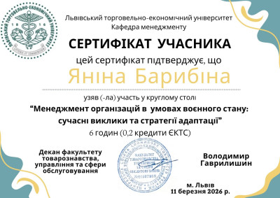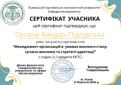 - Участь у онлайн-форумі «Фінансова грамотність та сталий розвиток», підвищення кваліфікації за видом навчання за програмою підвищення кваліфікації. Листопад 2024 р.