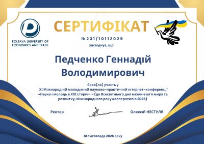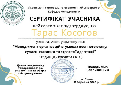 Тема дисертаційного дослідження: Організаційно-економічний механізм управління розвитком підприємств та організацій споживчої кооперації України.