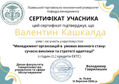 - Участь у міжнародній програмі стажування «Розвиток Soft Skills у професійній підготовці педагогів», організованій освітнім фондом Інститутом міжнародного академічного та наукового співробітництва (Institute of International Academic and Scientific Cooperation, NIP: 5223076497; KRS: 0000647929). Модулі програми стажування включали: Модуль 1 - Навички комунікації; Модуль 2 - Безперервне навчання та навички управління інформацією; Модуль 3 - Навички менеджменту. Липень-серпень 2025 р.